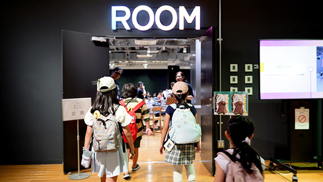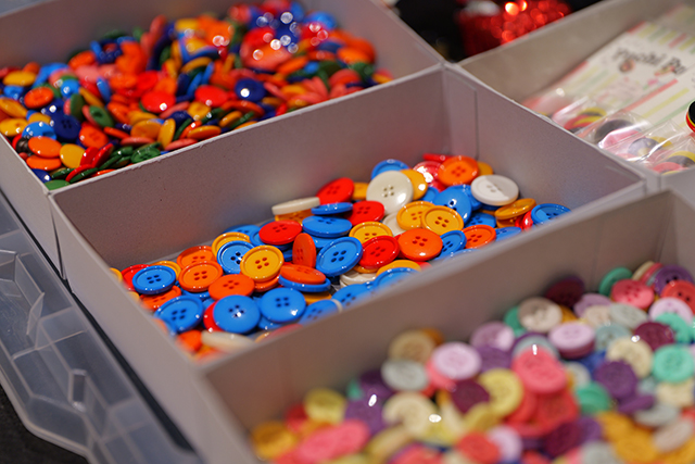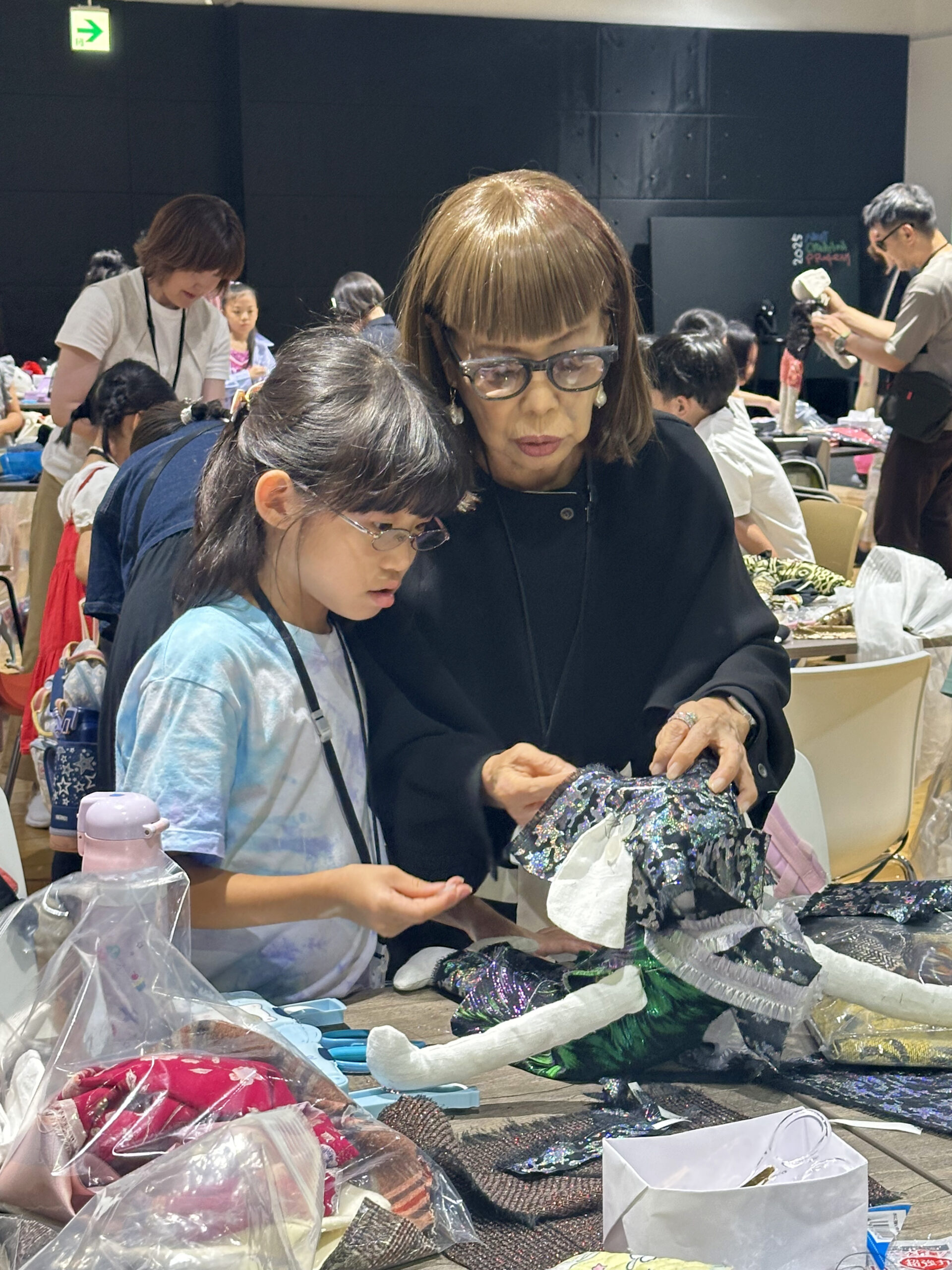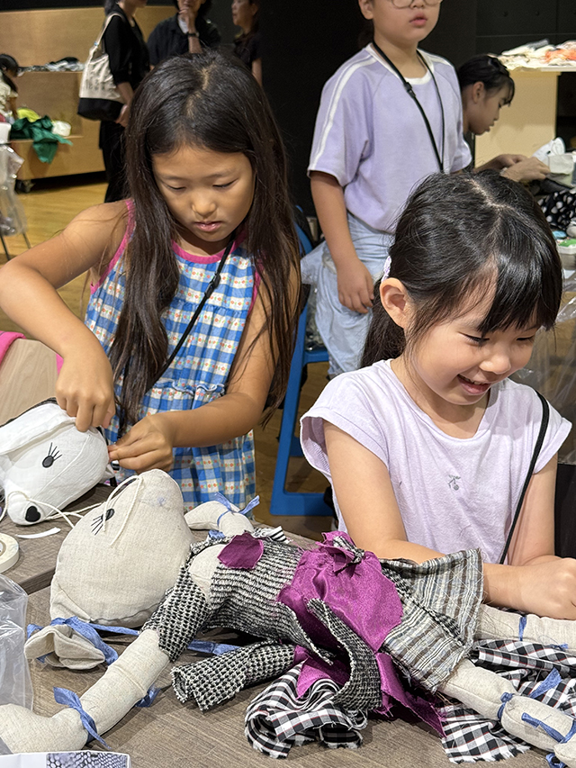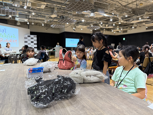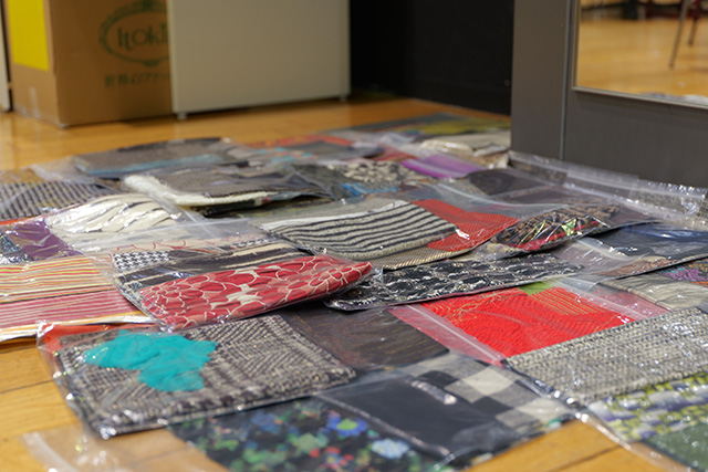 大きく4つのグループに分かれ、さらに数名ずつ着席したテーブルの上には、小さな生地が何種類も入った袋がひとり1セット用意され、針と糸を使えない低学年の参加者のために両面テープなども。そして会場内の数カ所には、気に入ったものを好きなだけ使えるよう大きな生地や、ボタン、リボンなどの小物類もふんだんに準備されました。