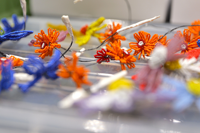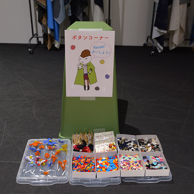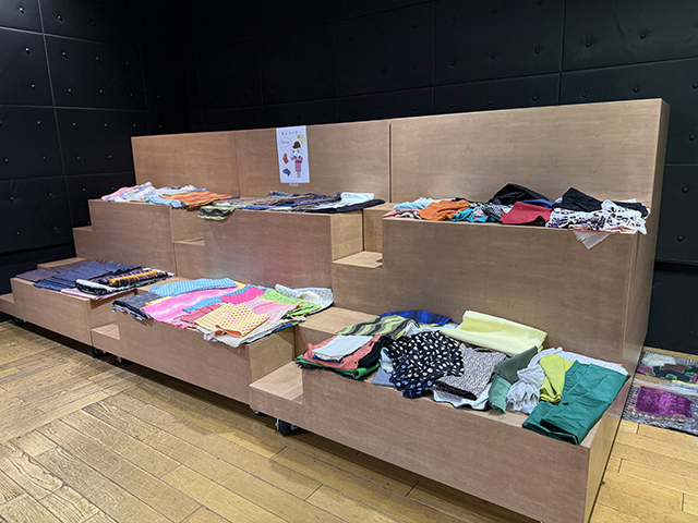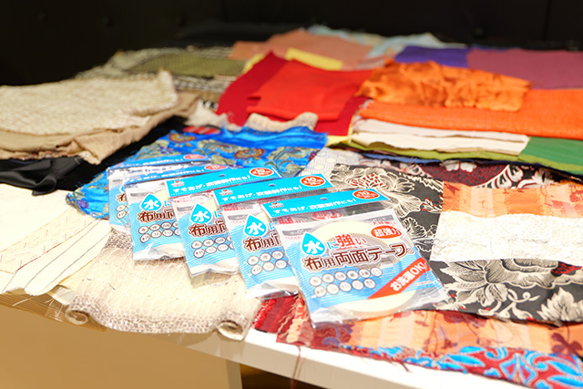 すべて、過去にHIROKO KOSHINOのコレクションに使用された生地の貴重な端切れや、今回のプログラムのため、たくさんのメーカーさんから提供いただいた小物や材料です。