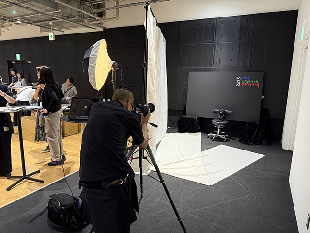 撮影してくださったのは、「こどもファッションプロジェクト」のもう一つのプログラム《ファッションムービー制作》でスチールカメラコースの講師を務めるファッションフォトグラファーのZIGEN先生です。パリや東京をはじめ世界中のファッション現場で仕事をしてきたZIGEN先生ですが、子どもたちばかりこんなに大勢を撮影したのは初めての経験だったのではないでしょうか。参加者たちはそれぞれ、自分のぬいぐるみを胸に抱いたり肩に乗せたり、つくった洋服もさることながら参加者それぞれの個性もよく現れた記念撮影大会でした。