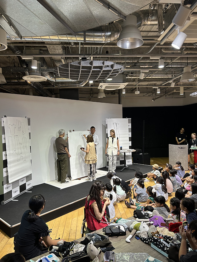 翌5日の講座は、ヒロコ先生のライブドローイングから始まりました。ゆま先生をモデルに、その服装のスタイル画を大きな模造紙いっぱいに描きます。使うのは筆1本。細い線も太い線も自由自在に描けることが筆の魅力だとヒロコ先生は語り、参加者たちは近くに集まって熱心にその様子を観察していました。