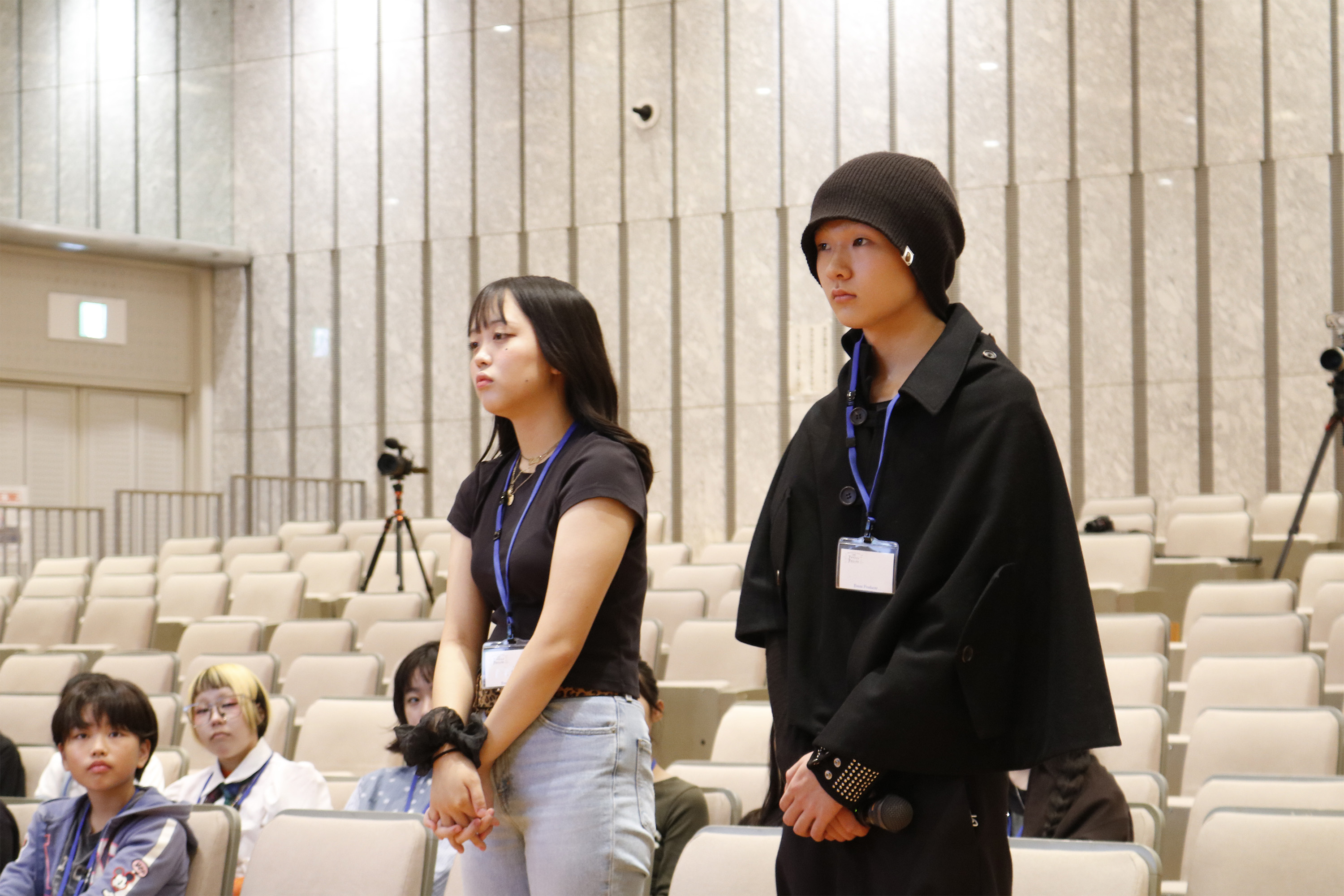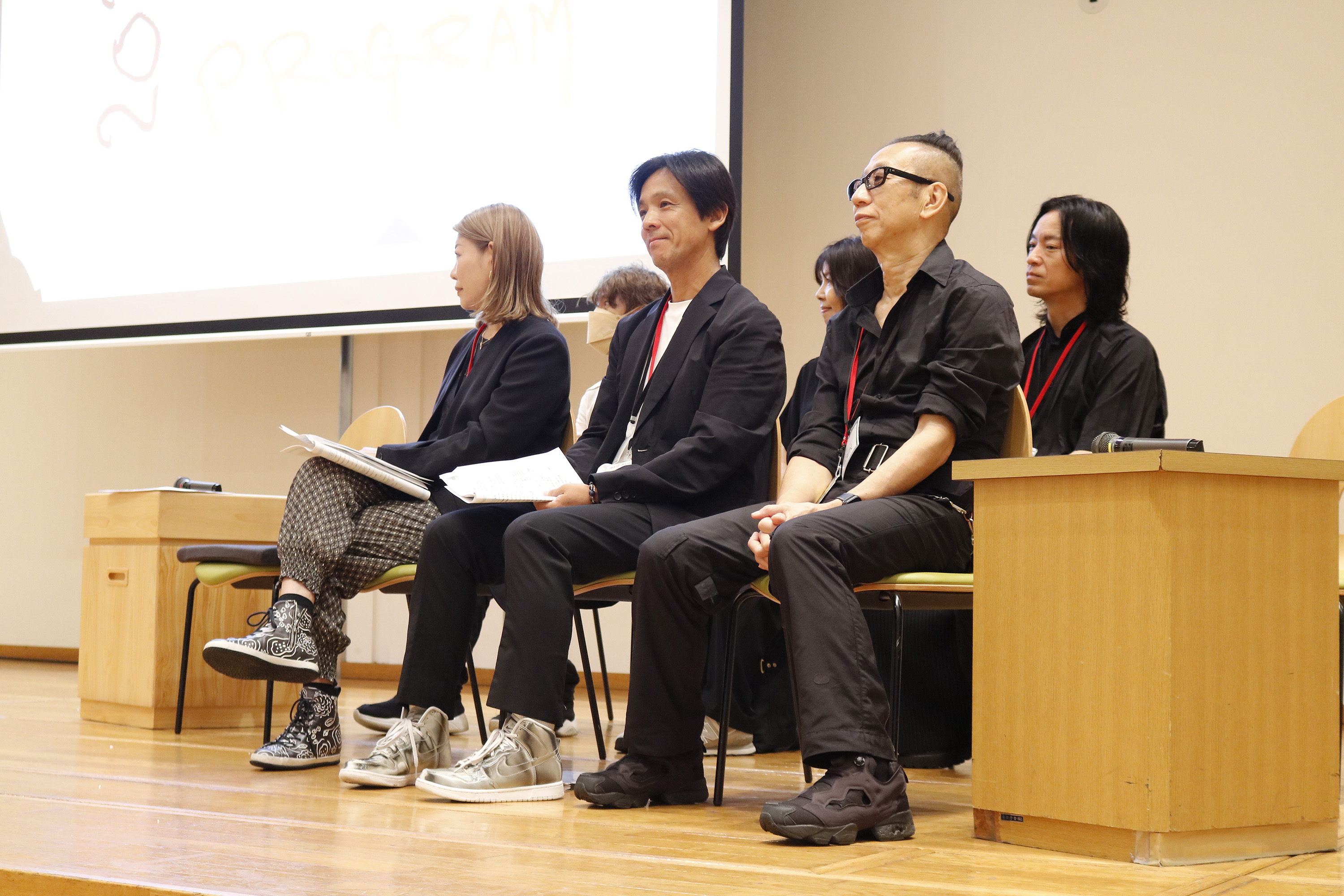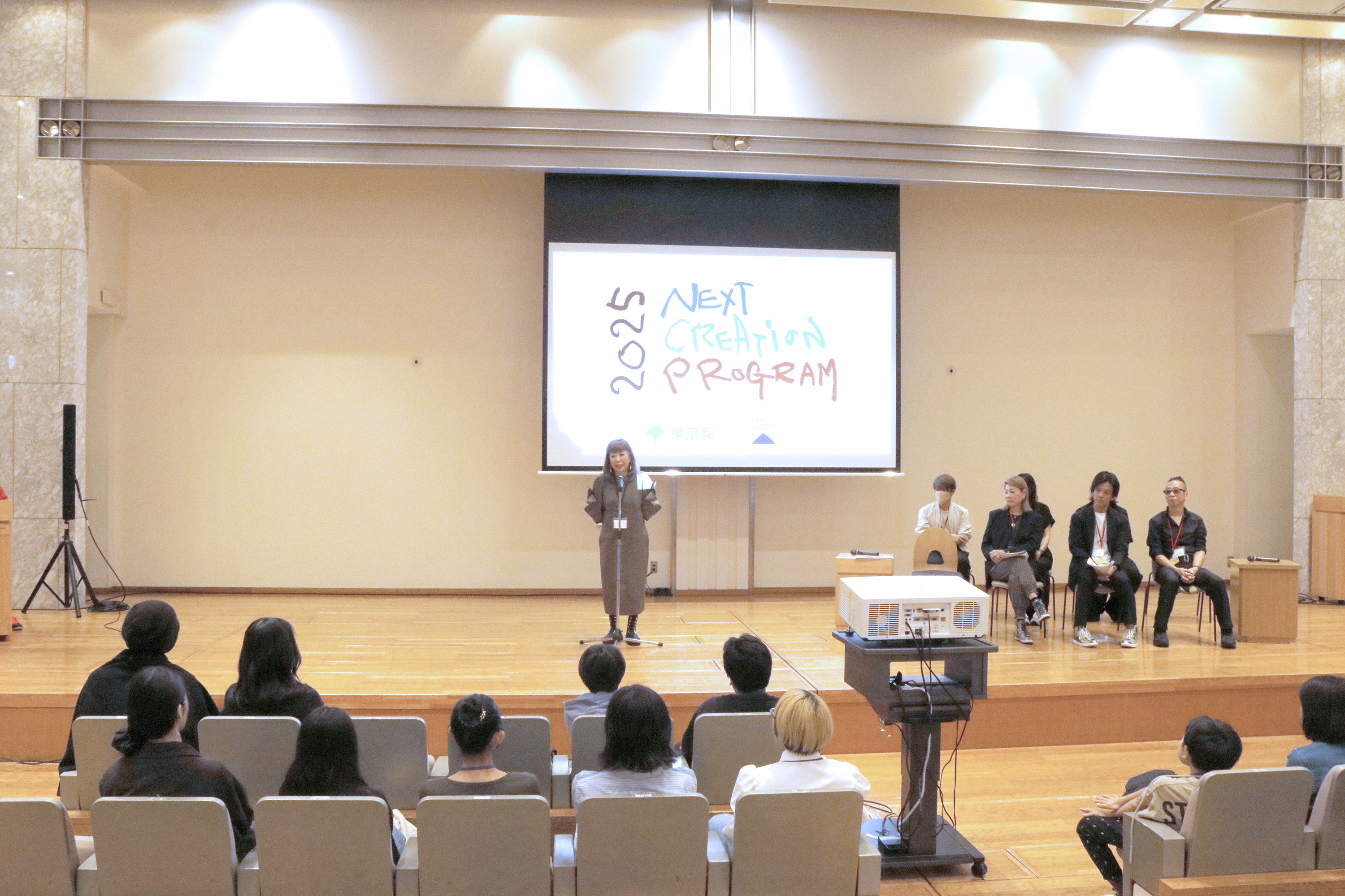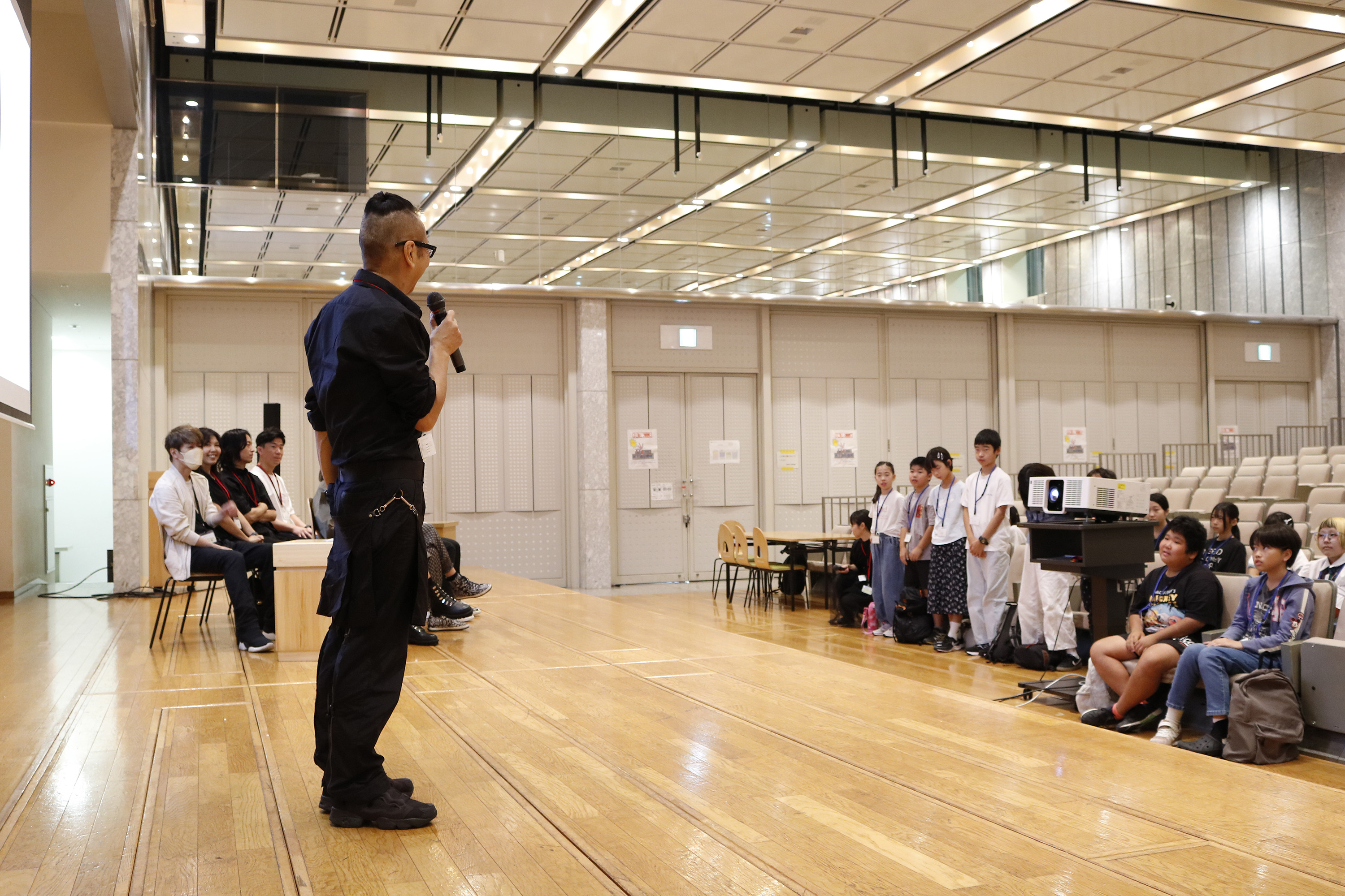 コレクション動画の後は、イベントプロデューサー半田誠先生、写真家のZIGEN先生、映像クリエイターの桑野徹先生、スタイリストの藤崎コウイチ先生、ヘアメイクの鈴木節子先生と原田忠先生が、それぞれ自己紹介とご挨拶。そしてご自身の担当コース参加者に呼びかけて立ち上がってもらい、参加者もそれぞれ自己紹介。たくさんの大人もいる大勢の目の前で、みんなハキハキと自分の名前やこのプログラムに参加した理由や動機を話してくれました。