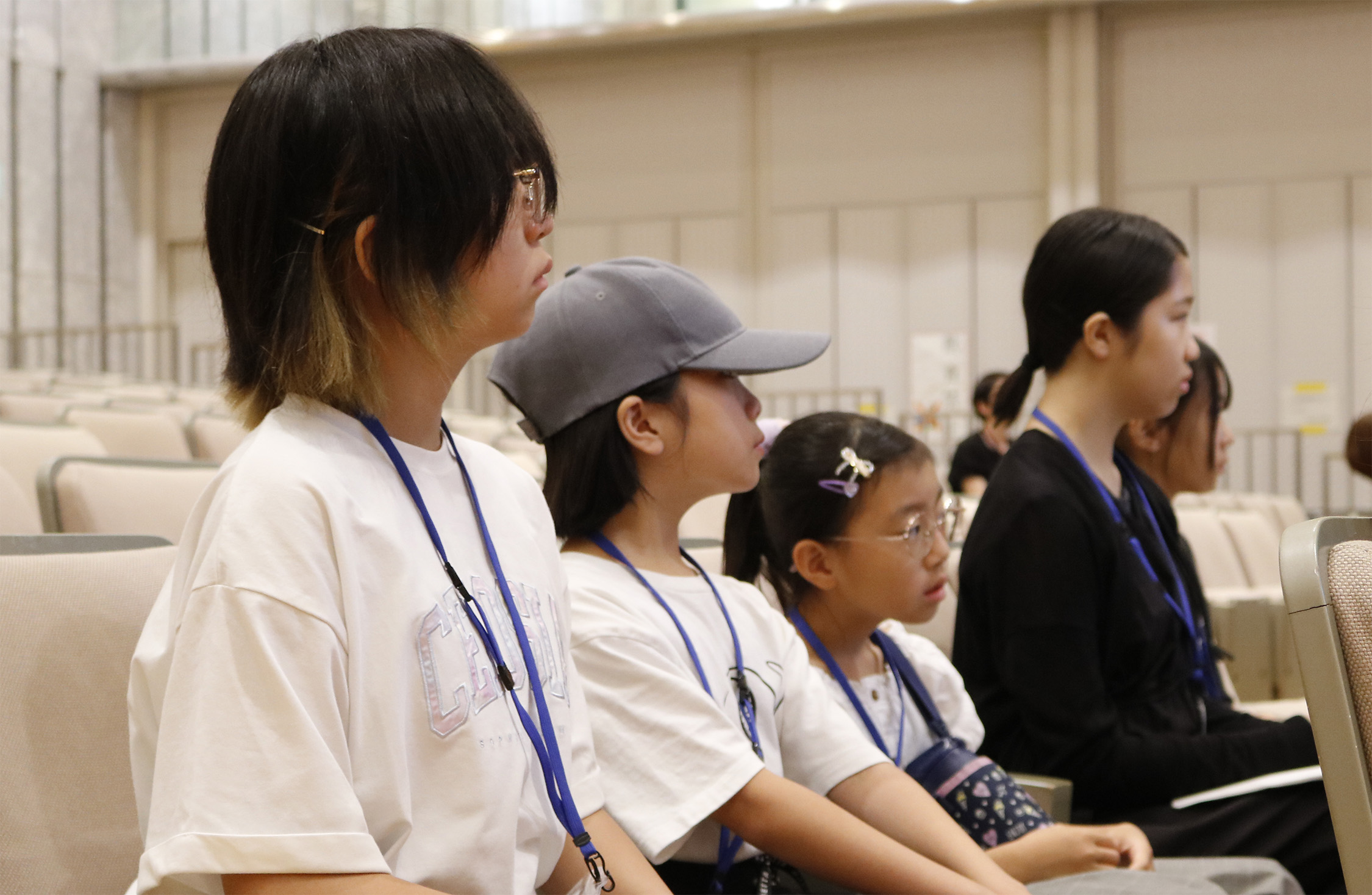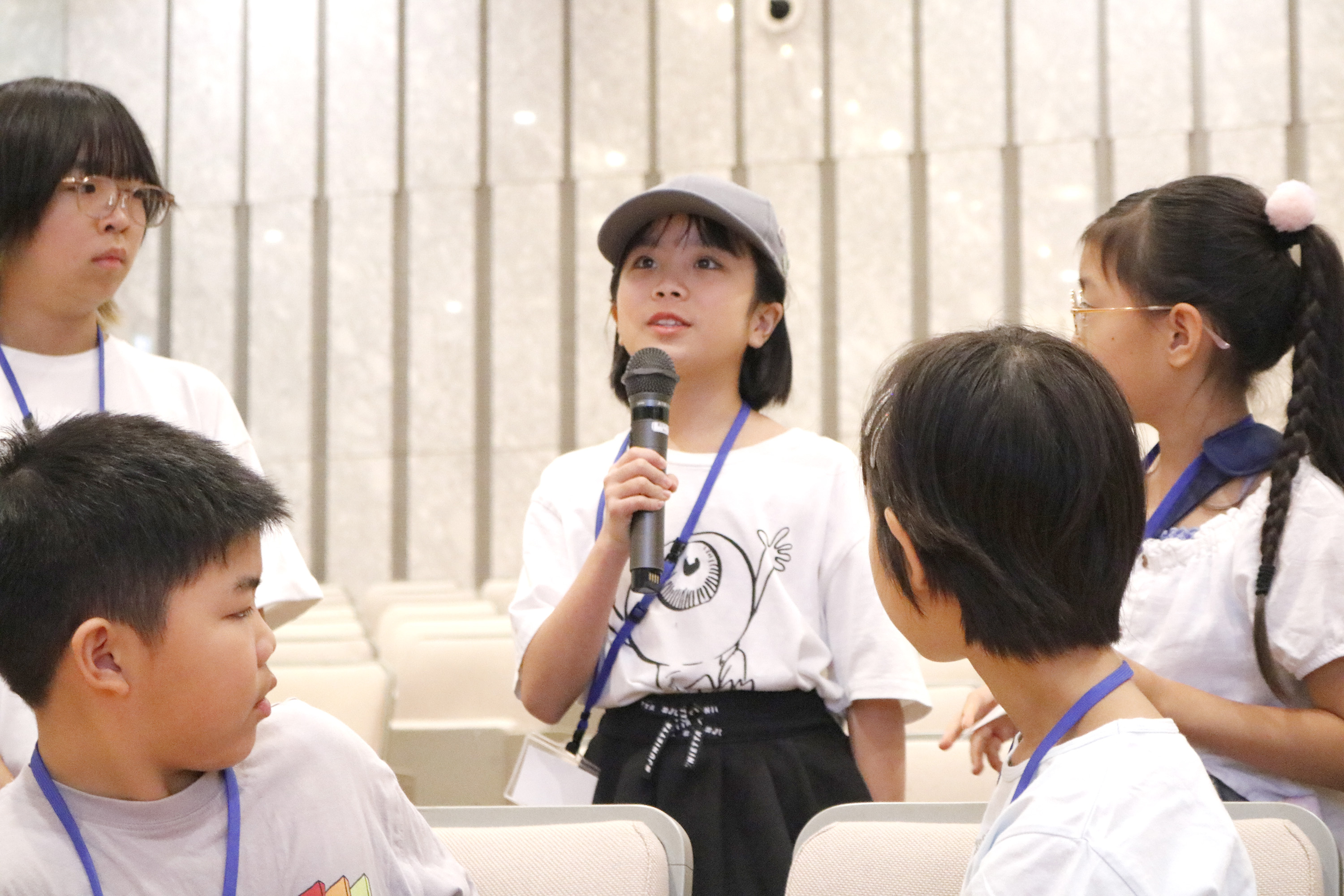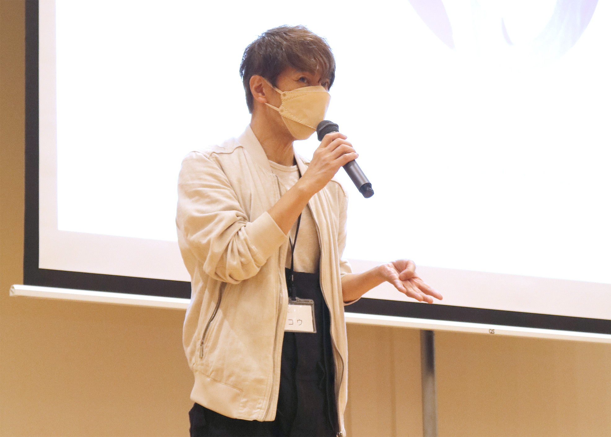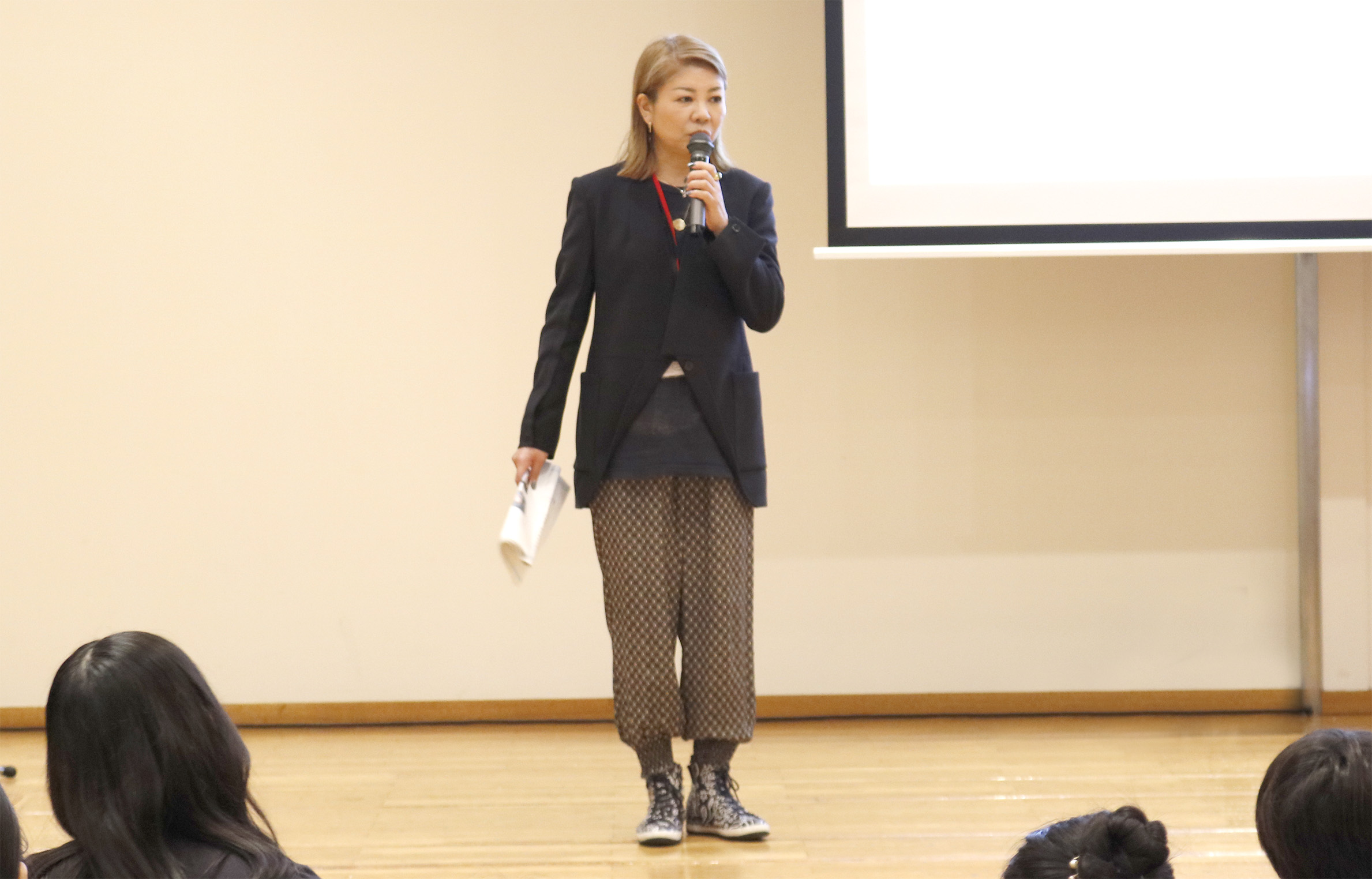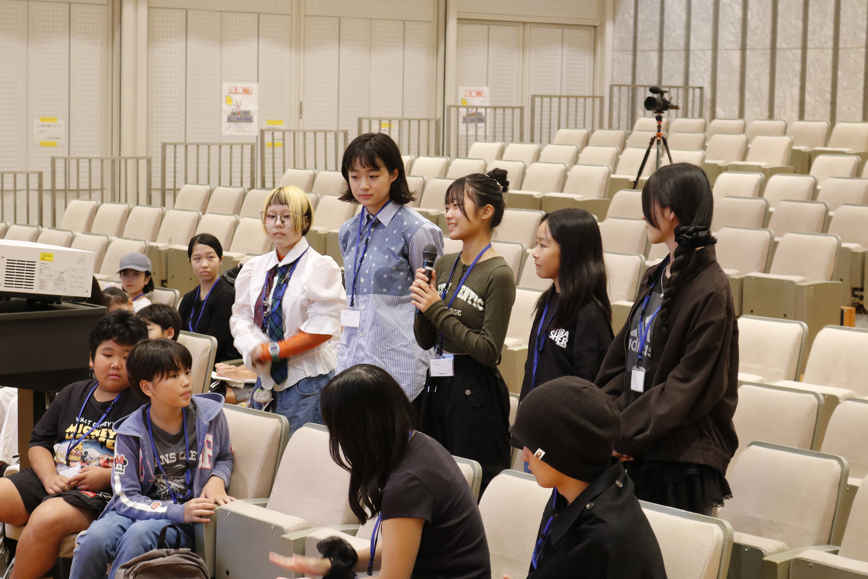 コレクション動画の後は、イベントプロデューサー半田誠先生、写真家のZIGEN先生、映像クリエイターの桑野徹先生、スタイリストの藤崎コウイチ先生、ヘアメイクの鈴木節子先生と原田忠先生が、それぞれ自己紹介とご挨拶。そしてご自身の担当コース参加者に呼びかけて立ち上がってもらい、参加者もそれぞれ自己紹介。たくさんの大人もいる大勢の目の前で、みんなハキハキと自分の名前やこのプログラムに参加した理由や動機を話してくれました。