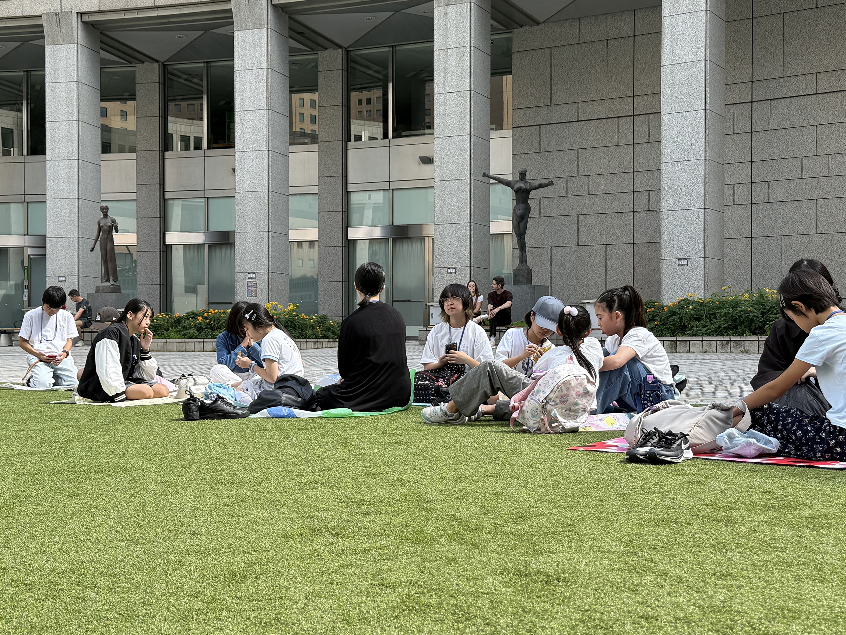 皆それぞれ、持参した昼食を手に都民広場へ。お天気に恵まれ、芝生の上でピクニック気分でのランチタイムになりました。